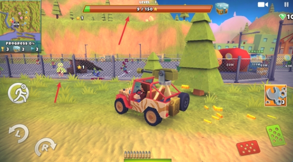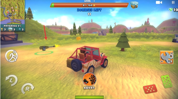 1、驾驶选定车辆在开放地图中移动,使用车载武器攻击僵尸,通过碾压与射击结合的方式赚取金币并完成任务目标。