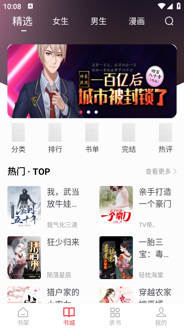 2.点击页面底部的书城页面,可以看到精选、女生、男生、漫画等分类