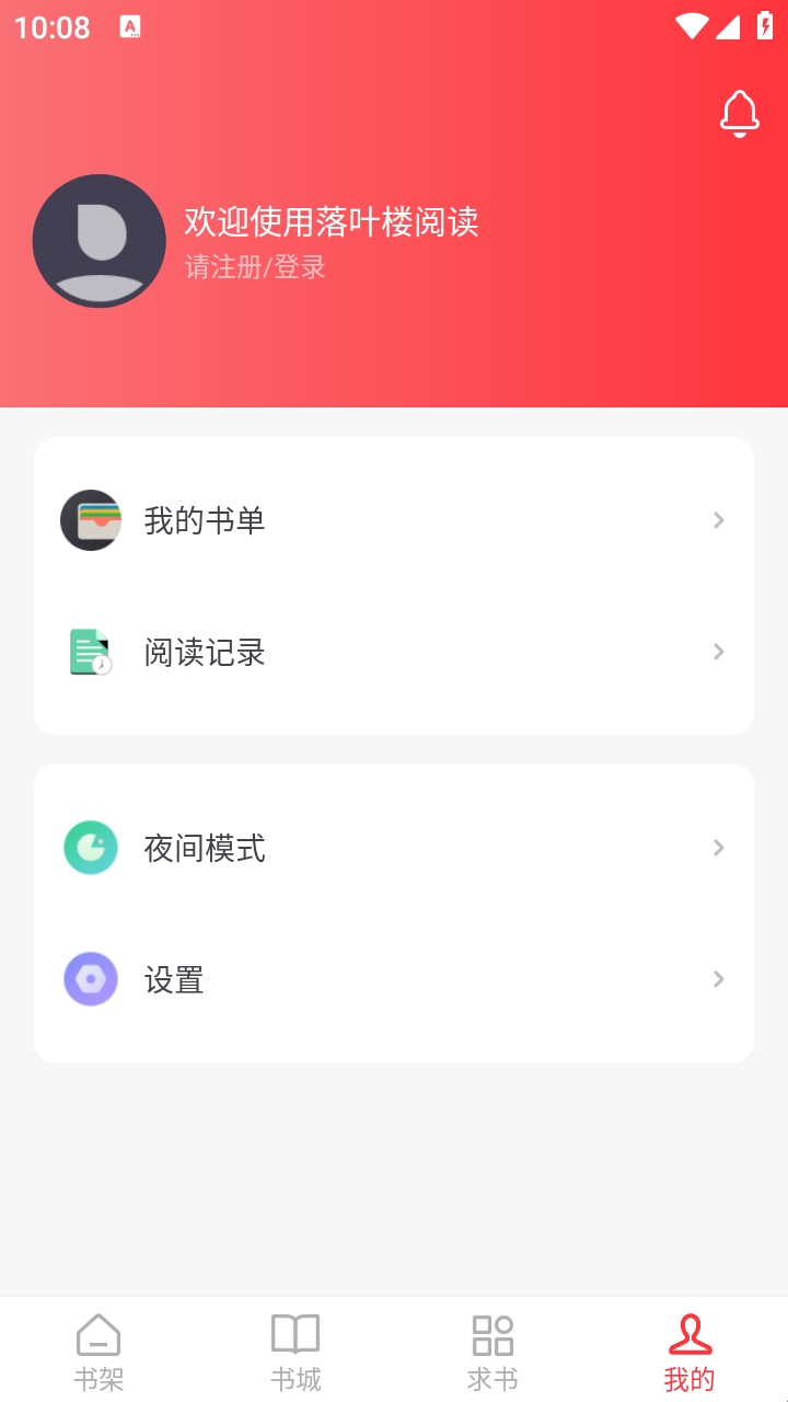 1.打开落叶楼阅读App,进入首页就是书架页面