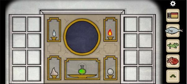 来到祭坛这边,将蜡烛全部放置并点燃,在托盘上放置咸鱼,上锁的洞口打开了。