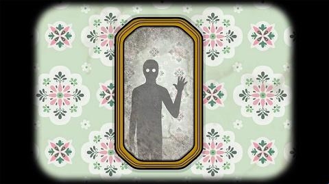 柜子里锁着一个玻璃罐子,上方还有一个花盆。镜子里倒映着一个诡异的黑影。