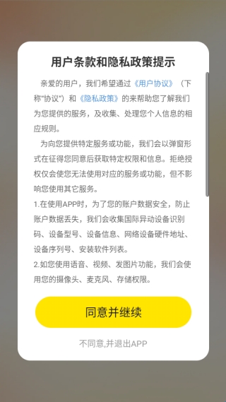 1、软件安装完成直接打开,进入弹框页面,点击同意并继续。