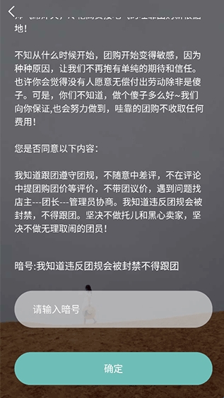 3、在这里输入暗号内容:“我知道违反团规会被封禁不得跟团”,然后点击“确定”按键;