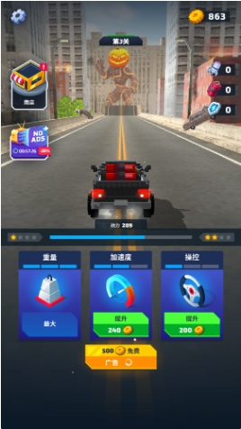1、每一次的撞击都会让你获得齿轮奖励,升级汽车的各个部件,并解锁更多全新的赛车,给怪物更震撼的冲击。