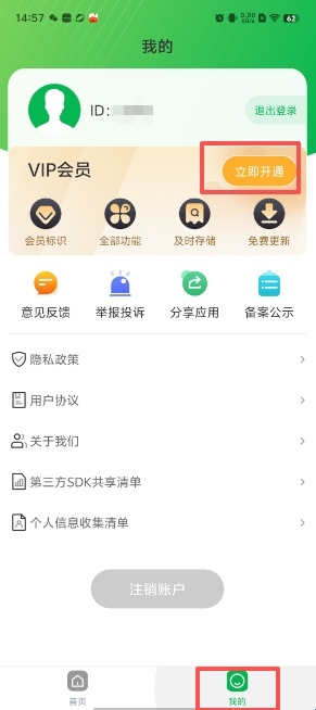 第二步:点击底部右下角“我的”,找到页面上的“立即开通”