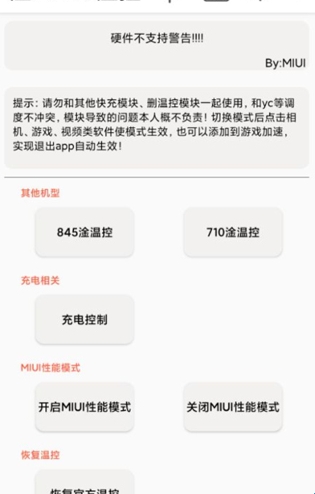 3、点击工具箱可查看其他机型的“淦温控”、充电控制、开启或关闭MIUI性能模式,以及恢复官方温控;