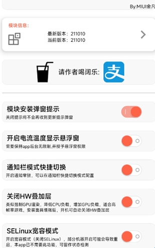 2、点击“其他”,可查看模块信息和开启或关闭下列各种模式,当然也可以通过支付宝请作者喝阔乐;