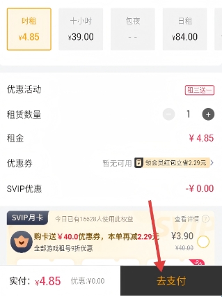 4、进入订单支付页面,选择租赁时长,确认租金等信息后,点击【去支付】按钮完成支付。