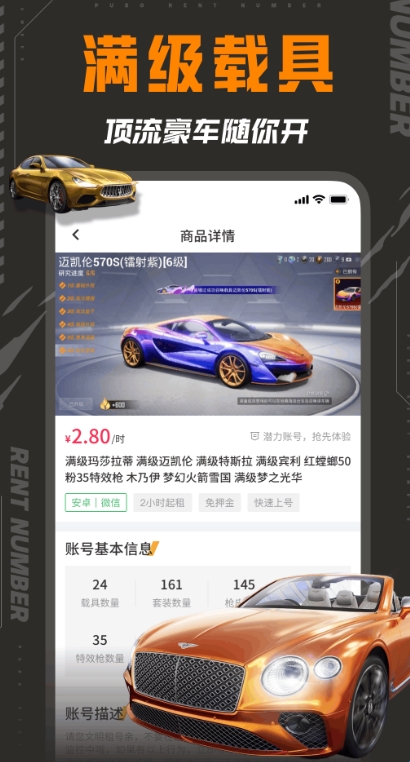 和平租号是一款专为和平精英游戏打造的租号软件。用户可以在软件中发现超多关于和平精英游戏的账号,上万款精品账号等您租赁,保时捷、玛莎拉蒂、火箭少女、洛天依等等服饰应有尽有,轻松满足用户的多种需求。而且软件24小时都有客服在线,实时处理您的各种问题!