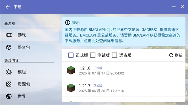 2、而在软件内容,玩家也可以点击首页下载跳转到此界面,在这里我们可以选择需要下载的正式版、测试版和远古版。