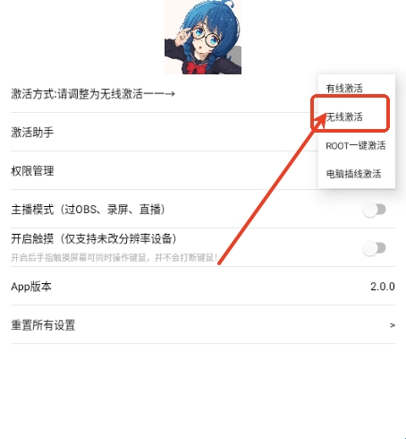 1、我们先选择激活方式,这里可以选择有线激活,无线激活,ROOT一键激活,电脑插线激活;