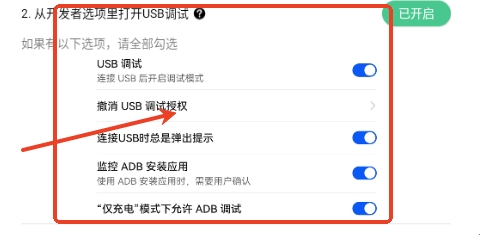 4、从开发者选项里打开USB调试,将以下4个选项全部勾上;