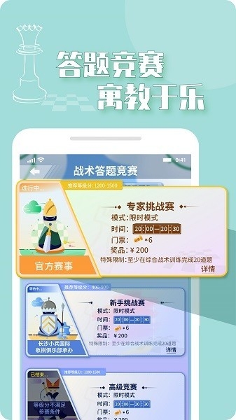 2、战术综合训练:循序渐进练习,稳步提升棋力、直观的即时等级分变化模式,清晰的纵、横向对比。
