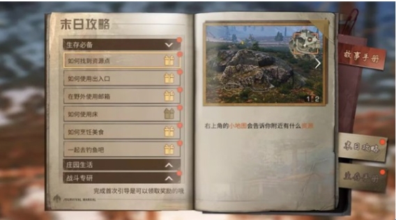 1、生存手册:完成新人任务,那么就能获得一个生存手册,不仅可以得到奖励,还能将熟练度提升,同时也会解锁援助任务。