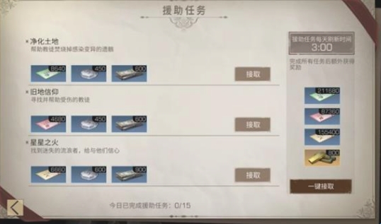 2、援助任务:玩家可以根据地图上的标记,直接找到援助任务发起人接取任务,只要完成任务,那么就能得到大量熟练度奖励,具体方式就是,通过“日程——日常事务——地图援助任务”,随时可以查看可援助任务的进度(庄园等级越高,可接取援助任务的数量越多)。