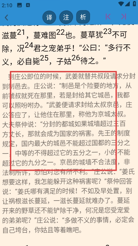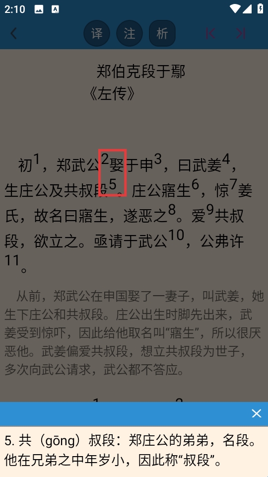 3、进入古文篇目后,查看原文,点击标注数字查看注释解析字词含义。