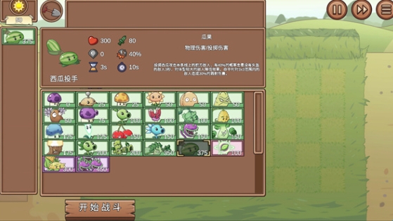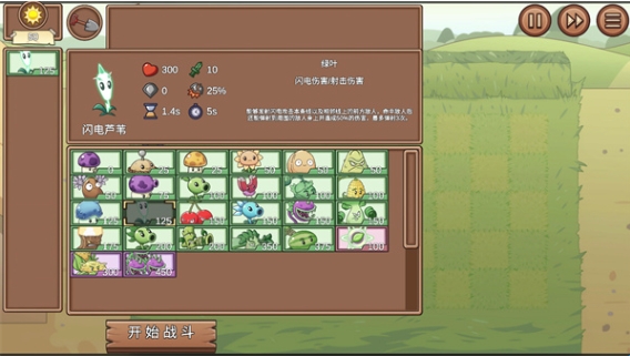 2、首先选择测试关卡,接着选择10个植物,然后点击下面的开始战斗。
