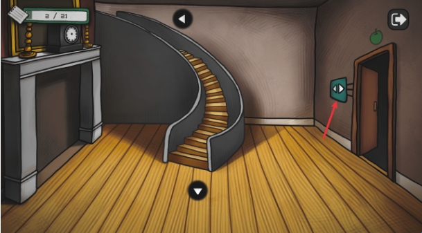 5、来到一楼后点击右侧绿色的箭头,按照刚才的提示“上、左、右、下、右、上”点击箭头即可打开门。