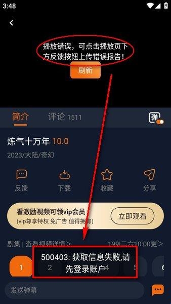 现在的囧次元需要登录账号后才可以使用,不然会提示“播放错误”,如图所示;