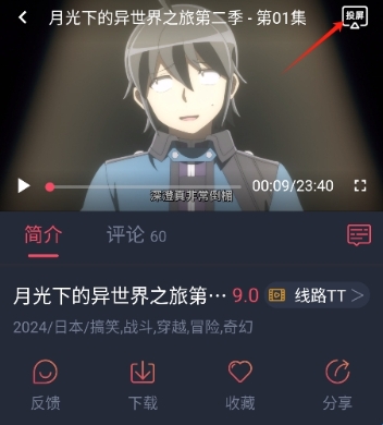 1、进入app之后,选择你想要观看的动漫,进入播放界面,点击空白处,找到投屏按钮;