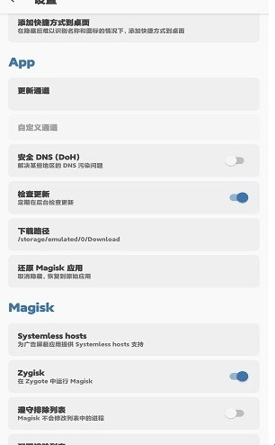 4、进入设置功能之后,找到并开启magiskhide功能,然后重启手机再次进入软件即可。