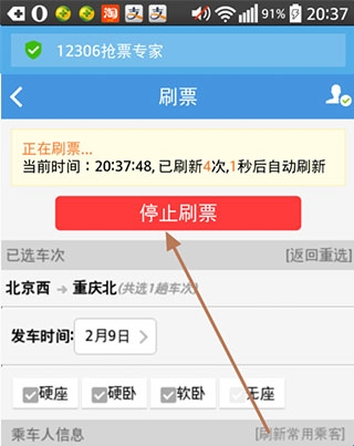 8、既然是刷票刚开始10分钟没有抢到,不可能一直守着,还可以一直挂着刷票,那样是捡漏,就是别预订了票取消了之类的。可以使用这个一直刷票等待捡漏。若捡到票了会有音乐提醒。