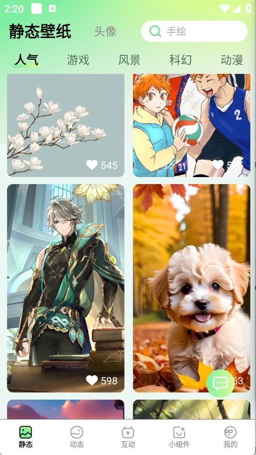 星动壁纸是一款资源丰富的免费壁纸软件。软件拥有人气、游戏、风景、科幻等超多类型的壁纸,无论是动静态壁纸,还是头像小组件都能免费收藏下载,并且支持提前预览,轻松让手机桌面切换不同风格。在这里用户还能进行许多个性化编辑操作,打造出专属的壁纸,欢迎感兴趣的小伙伴们下载体验。