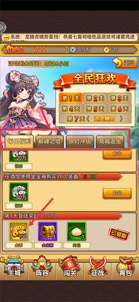 1、全民狂欢:全民狂欢中的每日福利、巅峰之塔、限时冲级、商城返金中都提供了金币,玩家完成对应领取条件后即可领取