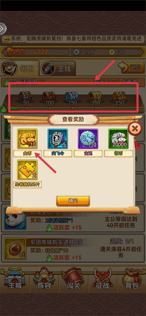 4、每日任务:玩家完成每日任务中的任务后可以获得活跃度,满足一定数量的活跃度后可以开启活跃度宝箱获取金币