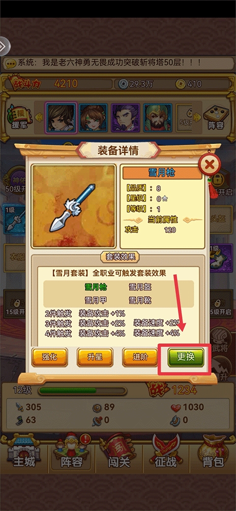 3、点击后会呈现装备的详情界面,然后点击更换