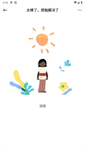 ●点击【这个烦恼已经解决】,你还可以继续选择,包括:结果是否有你预期的糟糕、说说这个烦恼是怎么结束的。当你的烦恼已经解决,解忧娃娃就会拥有一个灿烂的小太阳。