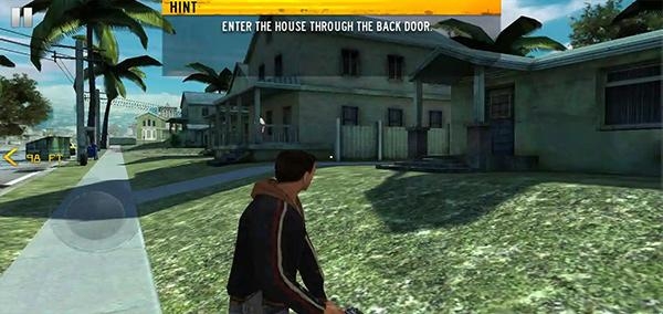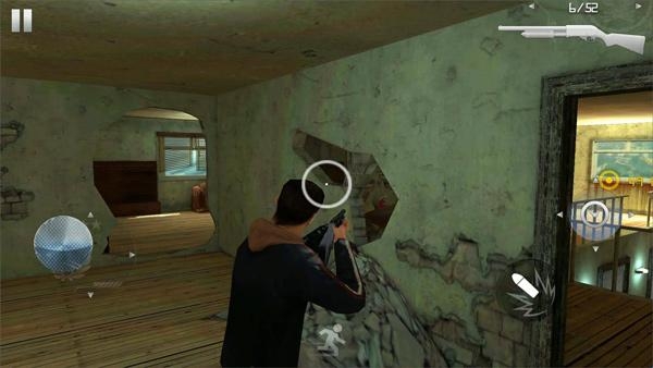 7、在游戏屏幕的左下方有一个小人拿着枪的样子,那个是可以转换人物的状态的,主要就是站着或者是蹲着的切换。这个在进行躲避敌人的伤害的时候非常的有用。同时玩家可以看到下图有一个黄色的光圈,那个是玩家可以完成任务的地方,比如爬窗或者是踹门等等。