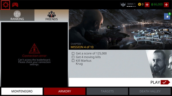 1、双击打开杀手47手游,点击左上角的齿轮按钮