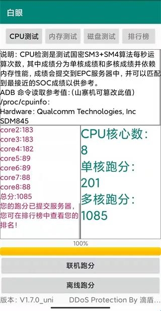 它有两个选项,一个「联机跑分」,一个「离线跑分」,可以检测手机多核数量,以及单核和多核的跑分成绩。