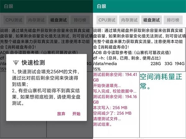 快速检测就是往手机里填充 256M大小的临时文件,通过对比前后的存储空间变化,给出消耗是否正常的判断,当然了,检测完的临时文件会自动删除。