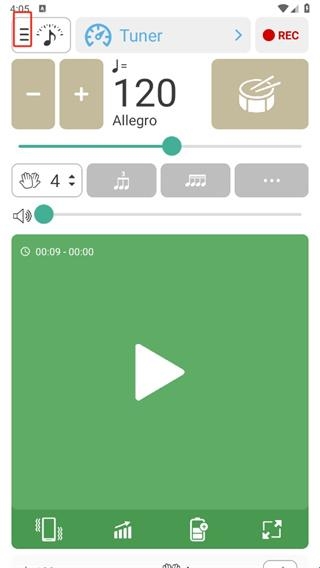 1、首先打开调音器和节拍器App,进入到首页中后点击左上角的【三横图标】;
