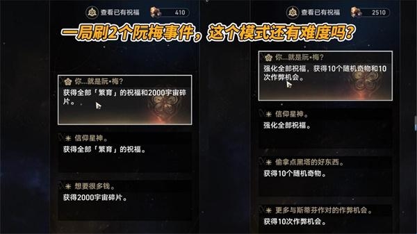 利用上述原理,在黄金与机械中,我们需要尽可能多的走【事件·异常】格子,以强行穷举的方式把阮梅两个事件刷出来。阮梅(其一):获得某一命途全祝福、2000宇宙碎片、全都要(队伍需携带阮梅);阮梅(其二):强化全祝福、获得10个随机奇物、获得10次作弊机会、全都要(队伍需携带阮梅)。