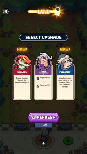3、消灭怪物会获得经验值,提升等级后玩家可以选择召唤新英雄或者选择一个强化提升英雄的能力。