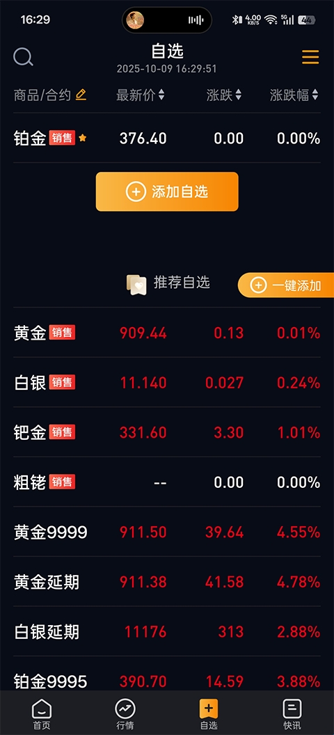 3、在行情页面点击“添加自选”,可自定义关注列表,实时查看特定贵金属的行情。