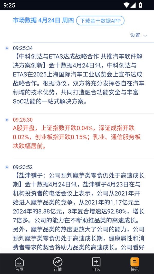 2、点击底部菜单“行情”,可查看更详细的K线图、MACD、布林带等技术指标,结合分时线、资金流向分析工具,辅助判断市场趋势。
