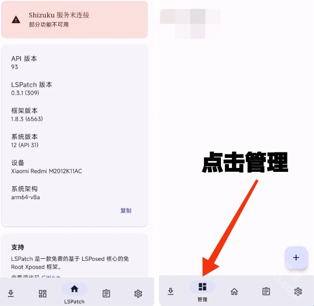 1、将 LSpatch、WeChat Pad以及微信依次安装完成,随后打开 LSpatch,点击“管理”选项,具体如下图所示: