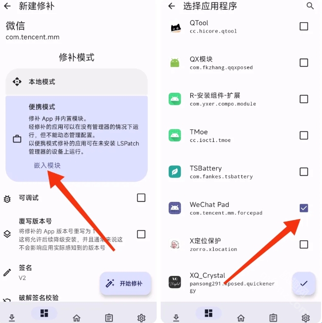 4、这里选择便携模式,接着点击“嵌入模块”,勾选已下载好的 WeChat Pad,点击“?”号确认,再点击“开始修补”。