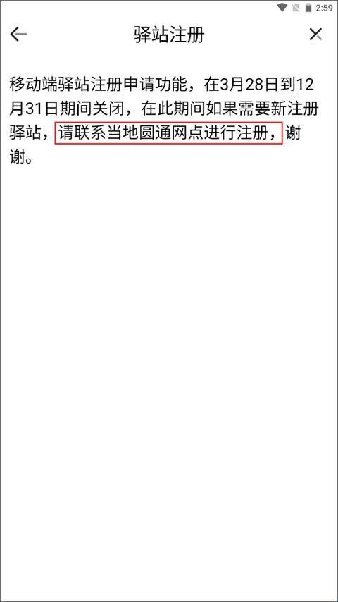 2、这时页面提示你app暂停了注册申请功能,你可以去当地的圆通网点进行注册。