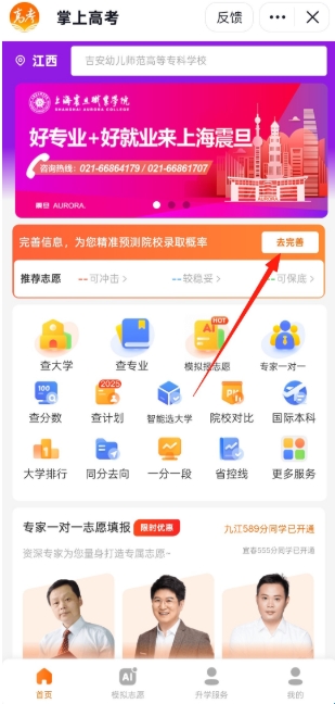 3、选择预测志愿会跳转到抖音小程序【掌上高考】界面,然后点击【去完善】来完善自己的分数信息。