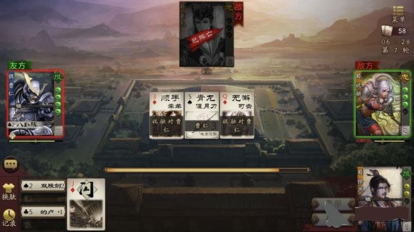 选择完角色之后,玩家获得系统随机给予的卡牌,通过卡牌的角逐来判定胜负。卡牌的数量一般分为几种,分别是锦囊、杀、闪以及血量回复。