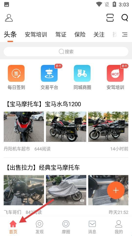 1、点击首页界面,集成安驾培训、交易平台等多样功能板块,展示宝马摩托车等出售信息,便捷获取机车资讯。
