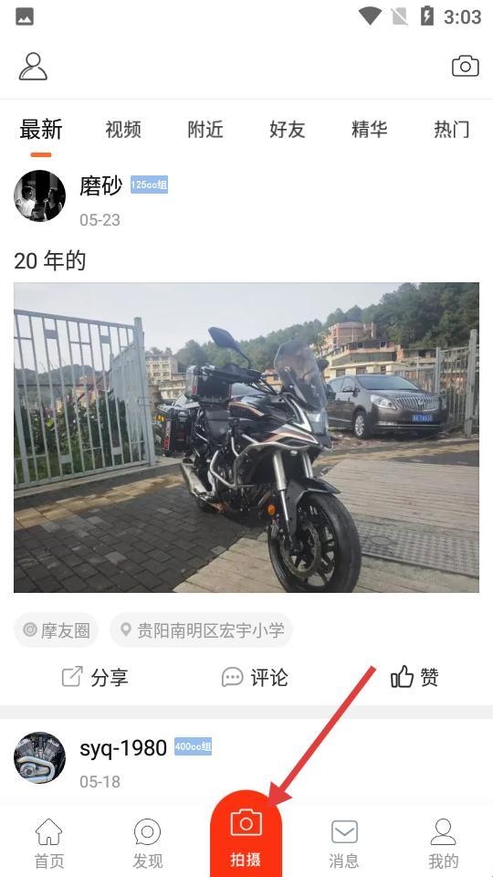 3、点击摩友圈界面,呈现摩友分享的摩托车靓照,可查看地点,还能进行分享、评论、点赞等互动。