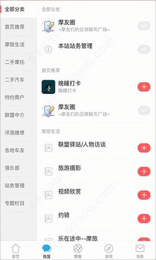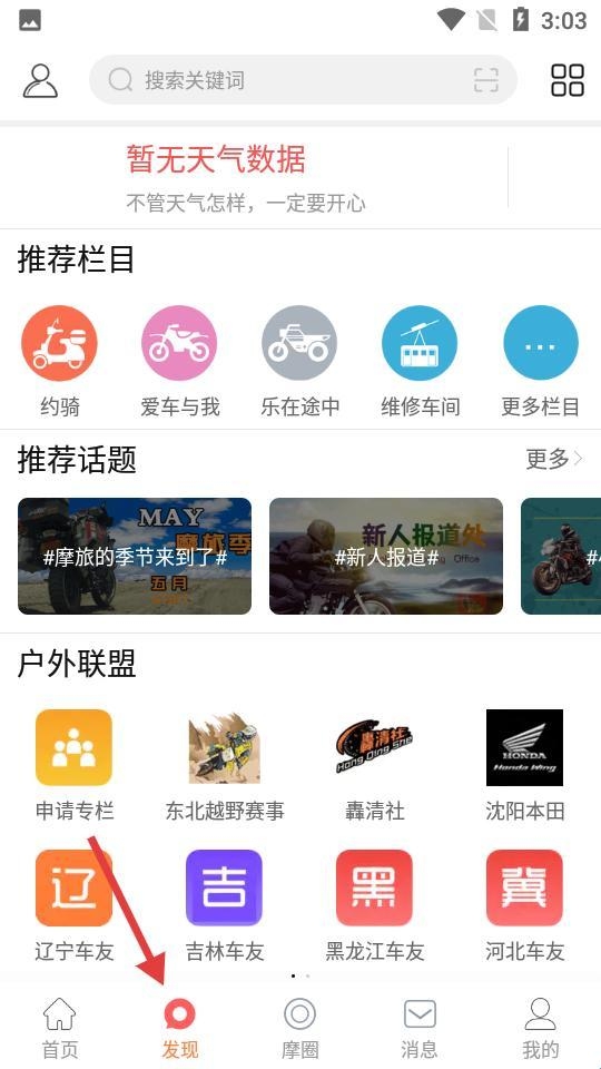2、点击发现页面,含推荐栏目与话题,如约骑、爱车与我等,还有户外联盟车友组织,探索摩旅新精彩。