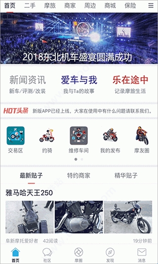 1、顺应移动互联网发展浪潮,向广大摩托爱好者展示了一个更加专业的移动平台。