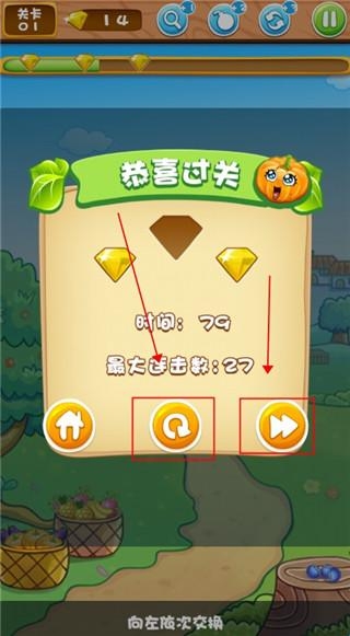 5、将所有的蔬菜水果全部消除即可获得关卡的胜利,可以重新挑战或者是前往下一关